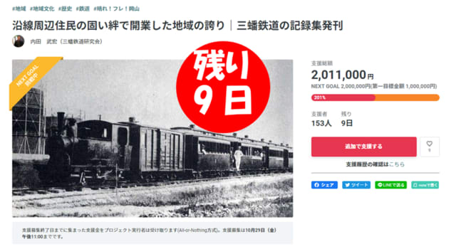 皆様の温かいご支援のお陰で、9月1日から始まった三蟠鉄道記録集発刊プロジェクトのクラウドファンディングは開始49日目という驚きの早さで、ネクストゴール目標金額の200万円に到達することができました!
