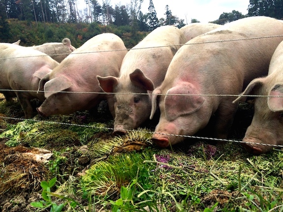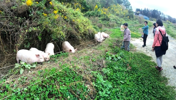 まず案内して頂いたのが、放牧豚の牧場です。これがまあなんと可愛くて人懐っこい豚ちゃんでしょう!人がいると、みんなでフゴフゴついてきます。放牧して育った豚は、ストレスも少なく自由に育つそうです。餌は農園で育てた野菜や自生している植物で、糞尿はそのまま土に返ります。良い形の循環農業ですね。面白かったのが、あえて発酵した餌を選んで食べているという事でした。ちゃんと発酵させてから食べる事で、消化吸収が楽になったりするんでしょうか?いやー、とにかく本当に美味しそうですねっっ!!