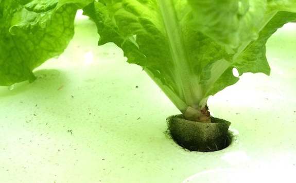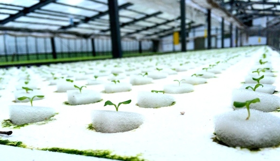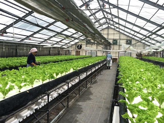 まず見せて頂いたのは、サンチュを育てているハウスです。穴の空いているボードに苗が植わっていて、そのボードごと水に浮いているという仕組みです。生産時期ごとにラインがしっかりと分かれています。