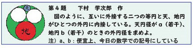 算額上の問題の特徴は、設問と解法のヒントをあるのですが、解答はどこを探しても見つけられない。それが大きな特徴で、ここから設問に連鎖が続いてゆきます。さて、この問題はどうだろうか。果敢に挑んでいただきたいとは思いますが、イメージよりは難しいのではないでしょうか。