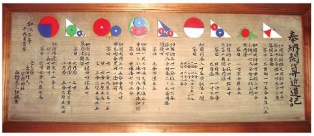 江戸期の人の集まる所、つまりは神社やお寺です。絵馬堂という場所に、板を額縁で飾って数学の絵馬として掲げたのです。これが算額です。今日的にいえば、学会発表もないころ、これも発表の一つの方法だったのです。