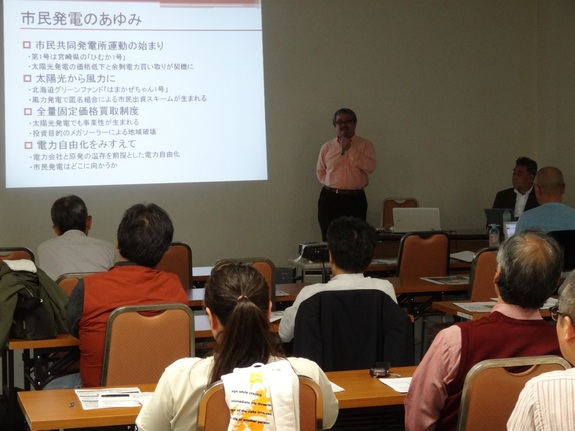 東京で15年以上前から市民共同発電に取り組んでいる山崎さんからは、市民共同発電の歴史・全国の状況などを発表していただきました。