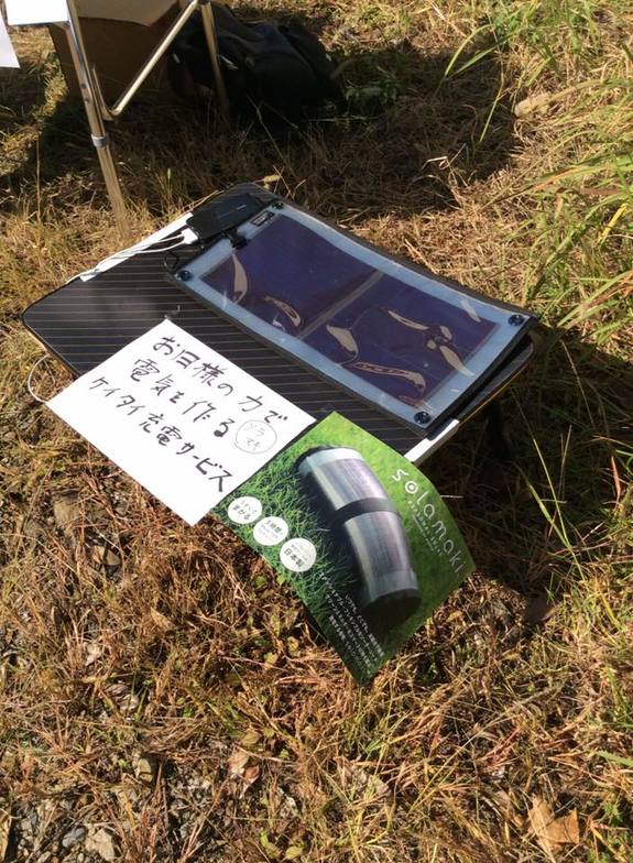 お日様の力で電気を作る小さな太陽光パネルで携帯の充電サービスも