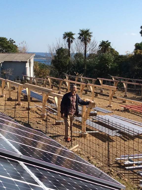 写真は年末の建設中の発電所です。架台がほぼ完成しパネルをのせるだけになっています。手前にみえるのは一昨年建設した発電所です。