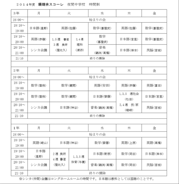 「珊瑚舎スコーレ夜間中学校」は民間が運営する夜間中学校として全国で唯一中学校卒業資格を取得できる学校として認められました。活動のすべてをご紹介できませんが、ご参考のため時間割を掲載します。