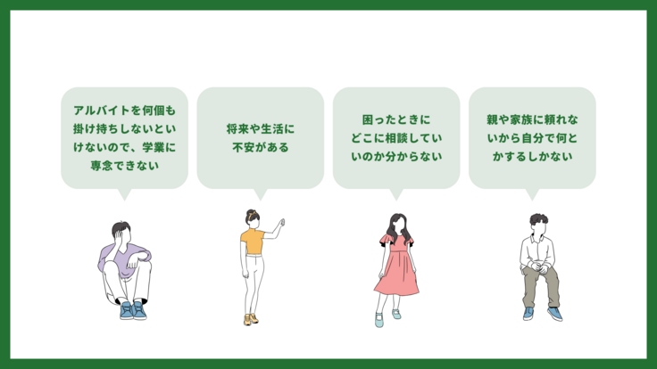 2021年に厚生労働省から公表されたケアリーバー(「ケア(care)を離れた人(leaver)」=社会的養護から巣立った若者を指します。)の実態調査によると、自立生活を送る5人に1人が赤字生活を送っていたり、進学しても生活費と学費のためにアルバイト掛け持ちしていたりと、経済的な理由によって学校を中退、休学する人が存在します。
