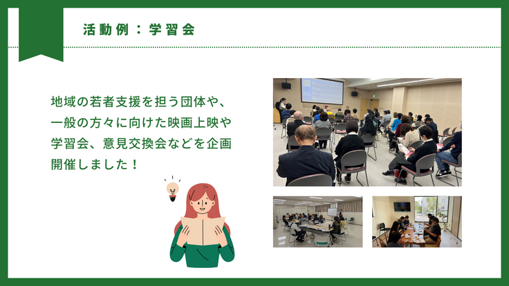 これまで、若者支援団体や山陰地方に暮らす地域の一般の方々が参加できる学習会を開催したり、伴走者への助成事業など、さまざまな活動を行ってきました。
