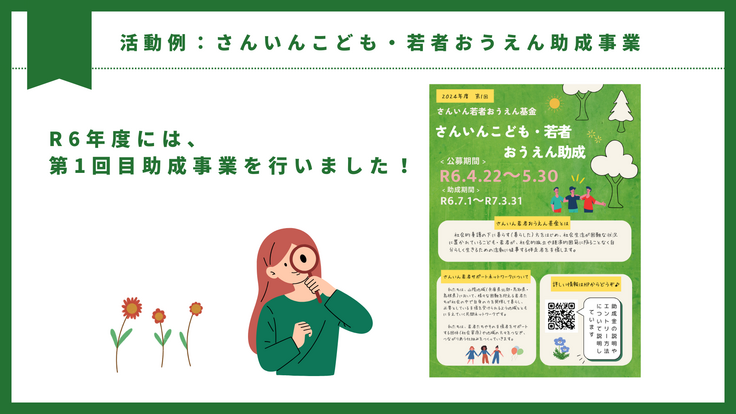 ・募集方法:寄付先団体は「さんいん子ども・若者おうえん助成」事業として公募(詳細はネットワークのHPやSNSに掲載いたします)
