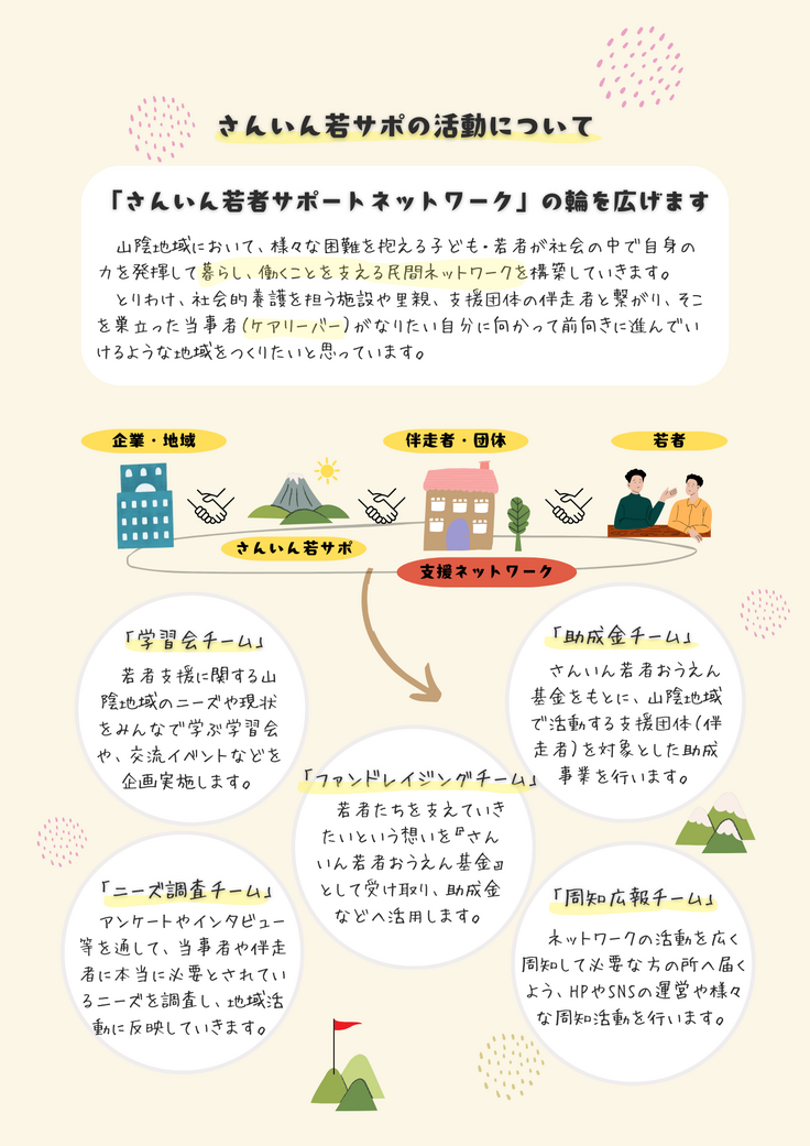 さんいん若者サポートネットワークは、そんな若者たちが、生まれた地域や家庭環境に関わらず、社会の中で自身の力を発揮し、安心して暮らせるためのネットワークづくりに取り組んでおります。