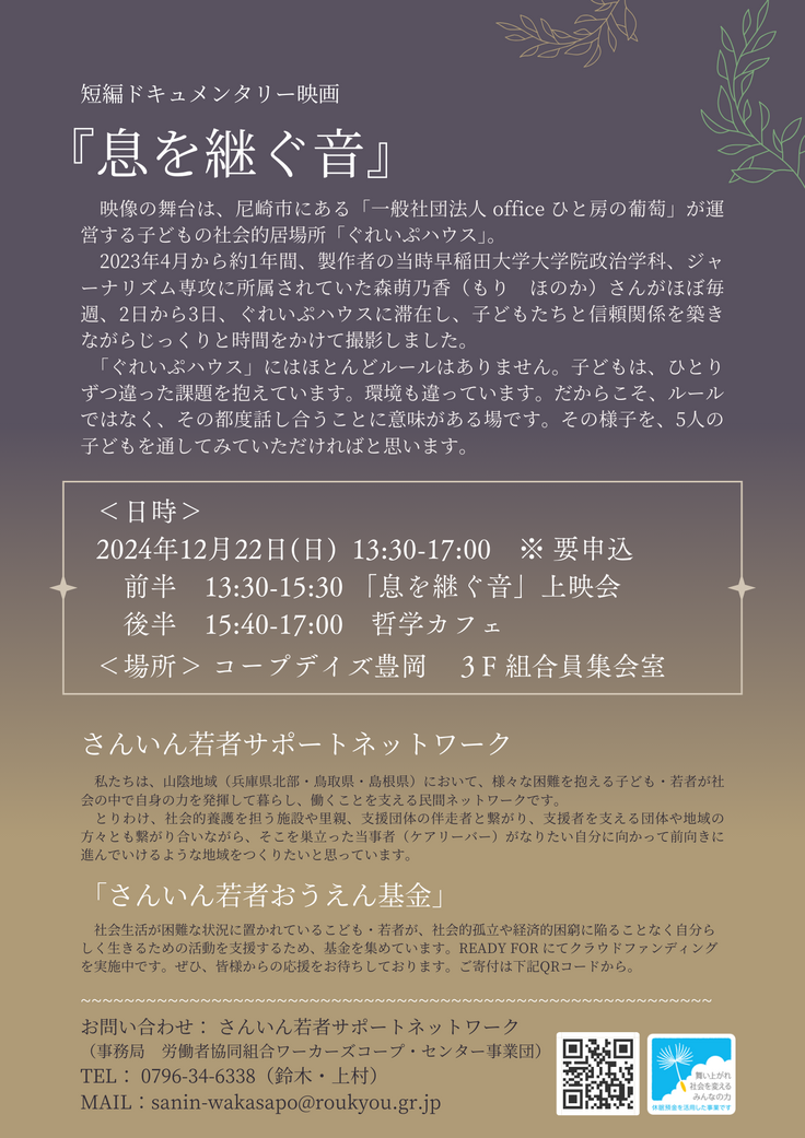 兵庫県北部では、12月22日(日)豊岡市にて、映画『息を継ぐ音』の上映会を実施します✨