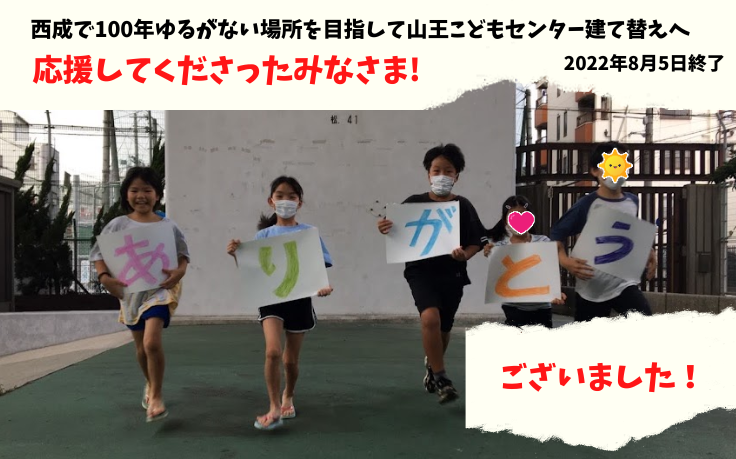 現在は、山王こどもセンター・山王おとなセンターの建物があった場所は更地となりました。これから新しい建物が建っていく過程も楽しみながら、無事に建物が建つことを祈って、邁進してまいります!
