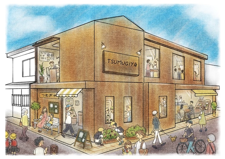 このイラストは、実はバリュー・リノベーションズ・さのの活動にご協力いただいている「さのサポ(さの町場まちづくりサポーター)」の学生さんに描いていただいた「SHARE BASE つむぎや」の完成イメージです。