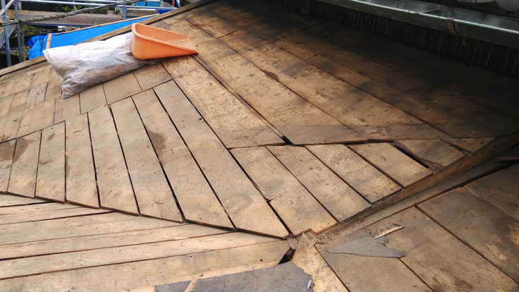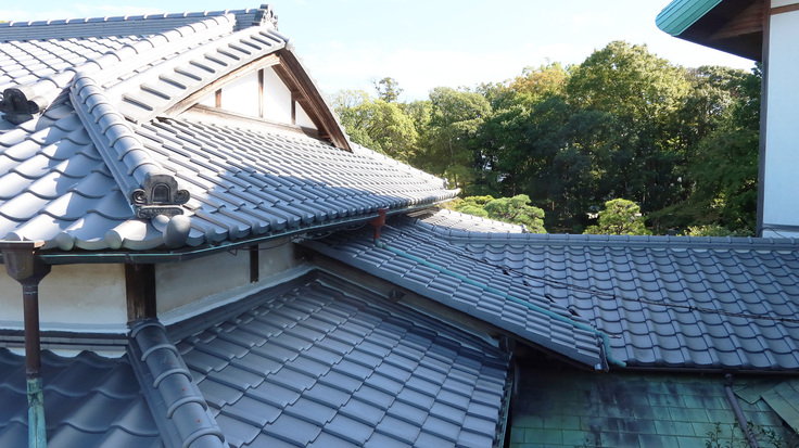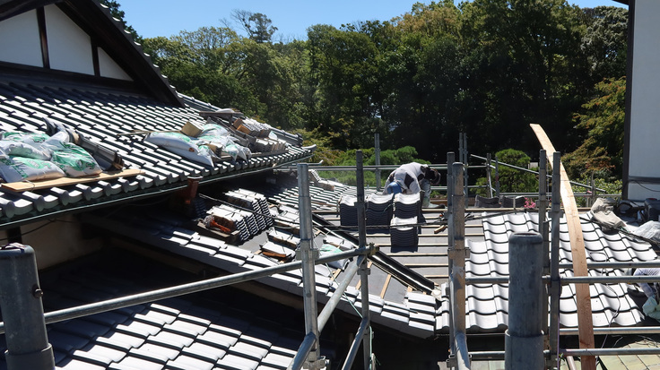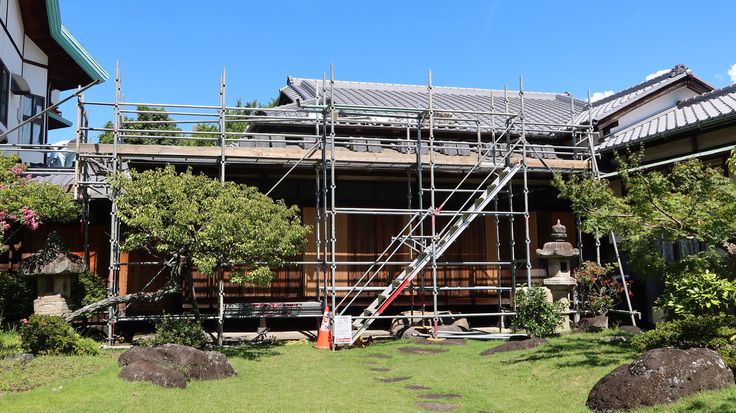 登録有形文化財「隆泉苑」改修のプロジェクト、第三期工事は第二期を終了した後に、約1カ月半の間建物を休めて開始。8月22日より外部足場組をはじめました。「不二庵、廊下、トイレ付近」を第三期工事の範囲とし、屋根の下地補修および瓦の葺き替えを行い、10月16日にすべて完了しました。