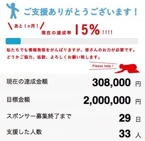 現在の達成率は、15%とまだまだです!プロジェクト達成のためには、皆さんのお力が必要です。どうかご協力ください!よろしくお願いします。