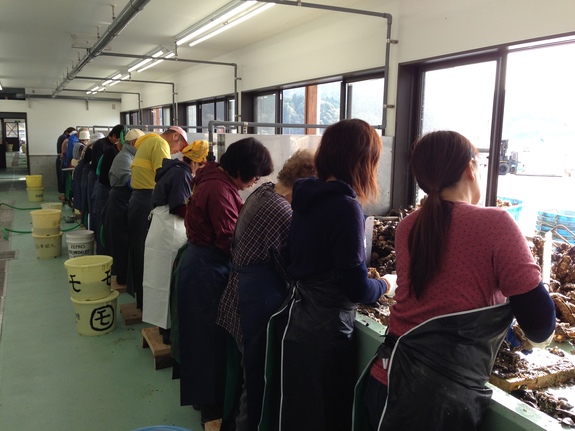 (石巻牡鹿半島の生産者が牡蠣剥きをしている様子)