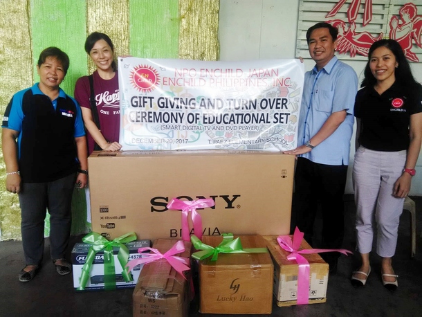 12月20日の午前中、エンチャイルドのフィリピンメンバーがプロジェクトの支援先の一つ、マニラ市トンド地区バルットのTパエス小学校を訪問し、デジタルのテレビモニター、DVDプレーヤーおよび教育用映像セット、そしてお絵かきノート(カラーリングブック)セット&色鉛筆(500セット)を届けました。