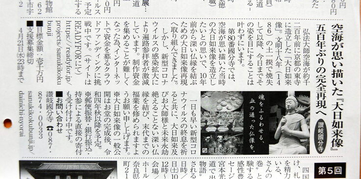 主に四国八十八ヶ所霊場会の公認先達さんたちに対して発行している「全札所を結ぶ情報紙」『へんろ』に今回の仏像造りとクラウドファンディングに対する取り組みを記事として掲載していただきました。