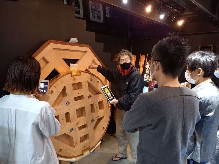 ↑仏像を支える台座の実物を前に建築家に説明する大森暁生先生