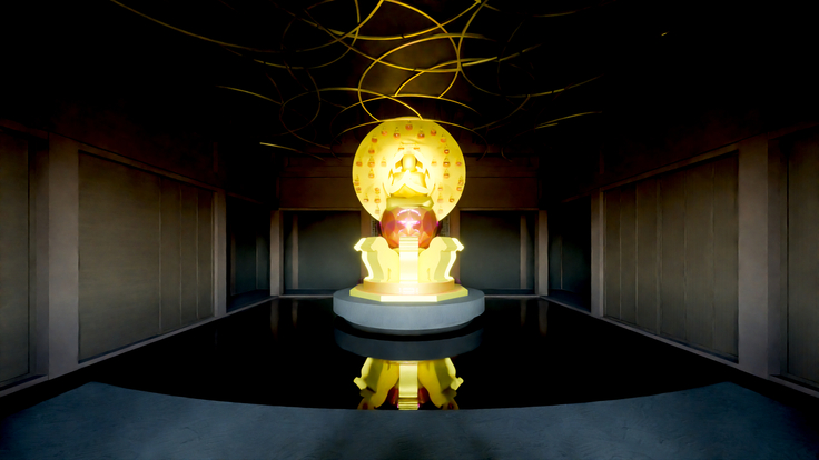 古代仏教の世界観では、広い海の中心に須弥山という山があり、その上に仏様の世界が広がっています。この世界観を今回のお堂の中にも凝縮し再現するため、床を水面に見立てた黒い反射する素材で一面目地なく覆うとともに、天井には、雲を思わせる金色の装飾を配しました。その空間の中で、仏様が蓮華の花にお座りになり、黄金に優しく輝きます。(設計および画像提供:成瀬・猪熊建築設計事務所)