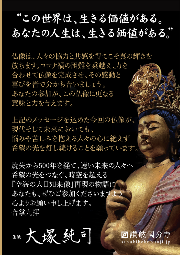 ブッダによって「人生は苦である」という諦観からスタートした仏教が発展し、最終的にたどり着いた境地が、「ならばこそ、愛そう」だと考えております。今回の仏像は、日本にその密教を伝えた弘法大師空海から皆様へのラブレターであり、同時に、今回仏像づくりにご参加いただいた皆様から、未来につづく無数の人々へのラブレターでもあります。