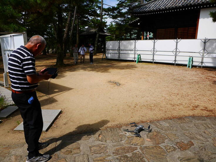 大日如来堂の屋根瓦の状況を改めて確認するために、ドローンを飛ばして点検を行いました。基本的に今使用しているものは江戸時代に焼かれた古い瓦なので、人間が上に上がって点検すると、そのことによって割れるリスクがあります。そこで今回はドローンを飛ばし、割れている箇所を特定したうえで、必要のない場所に負担をかけて破損リスクを高めることなく、ピンポイントで悪い場所だけ補修するという方法をとりました。