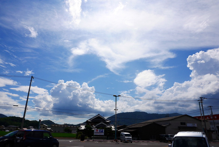 塗装工場に、お堂の天井に取り付ける金属の輪の塗装作業を見学に行ってまいりました。空はすっかり夏空です。画面右下の大きな屋根が塗装工場です。