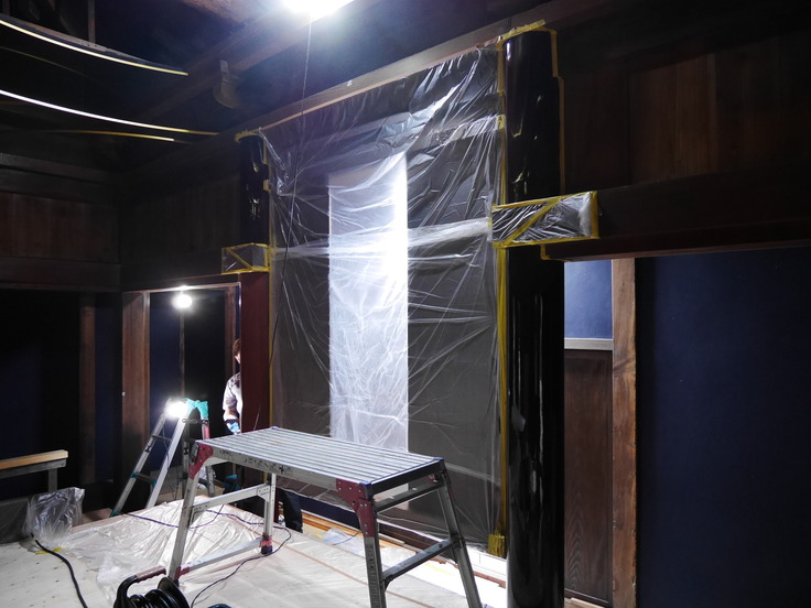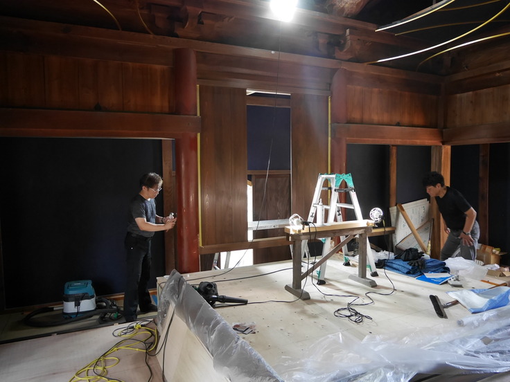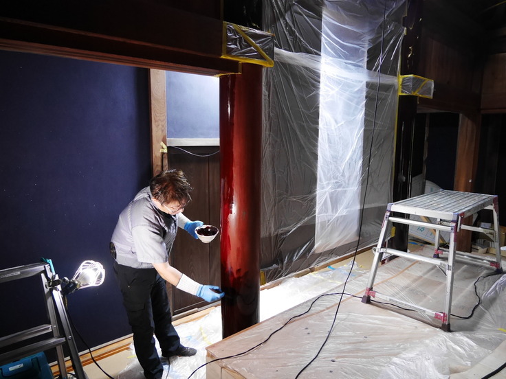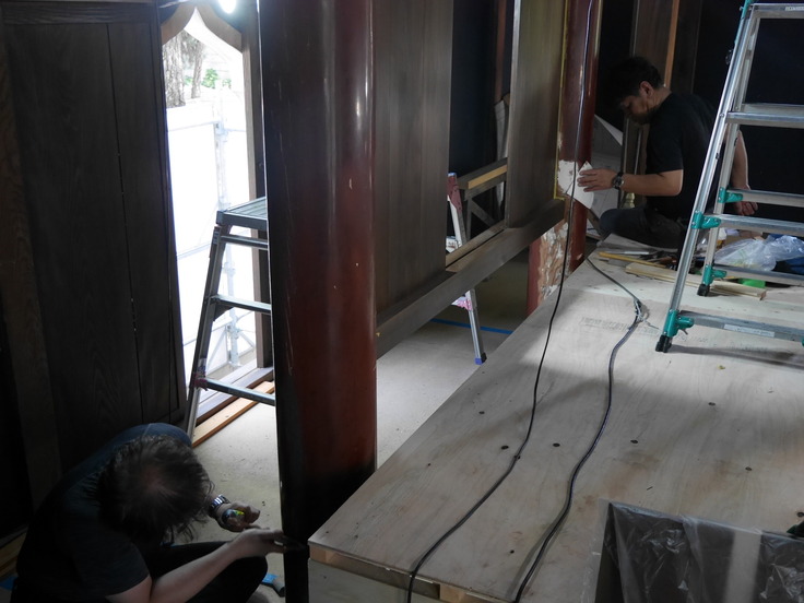 お盆休みで止まっておりましたが、仏堂改修の作業が再開いたしましたので、少しさかのぼって漆塗り作業のご報告をさせていただきます。手前の白い台の部分が仏像が安置される場所で、そのすぐ背後にある2本の朱漆塗りの丸柱の補修をしています。