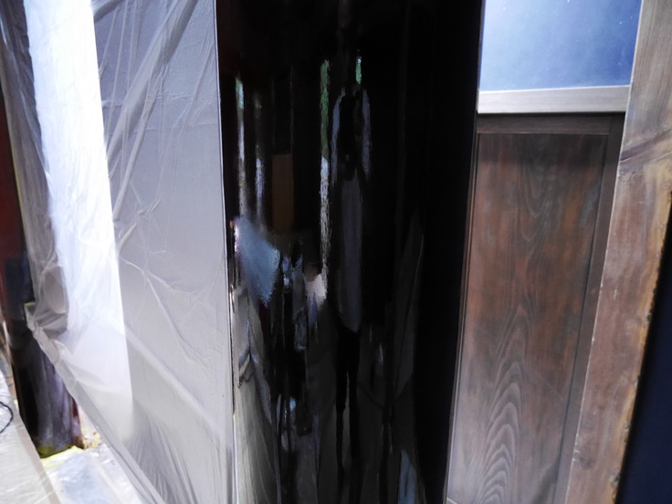 ここからお盆休み明けの作業になります。こちらは先に下地を作って乾燥させた状態のところに漆を塗り重ねてゆきます。当初、欠損部位だけの補修を考えていたのですが、下地を作った時点で、補修箇所が細かく全体に及ぶために、仕上がりを考えると全体に塗った方が良いということで、全体に塗ってゆきます。この辺はプロの判断にお任せしました。漆の層が全く新しいものになるわけではなく、もともとの漆の上に塗り重ねるわけですので、もともとあったものは活かして保存するという大きな方針とも合致しています。