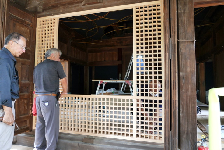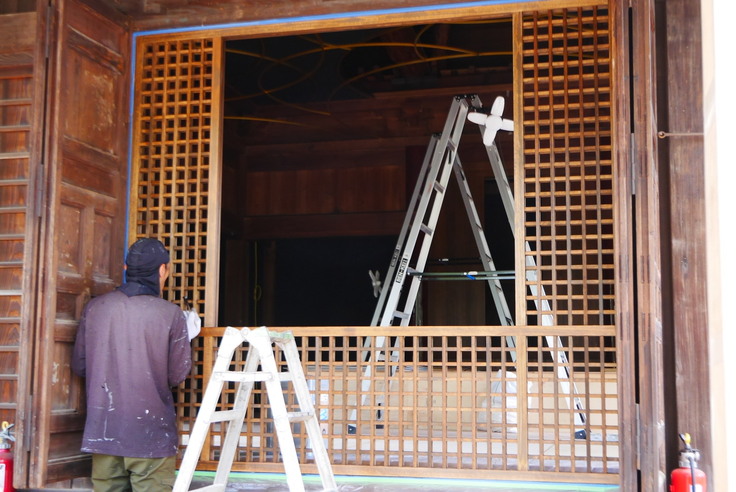 以前に白木の状態でご報告した正面建具の塗装についてご報告いたします。周囲の木質との色合わせのために茶色い塗装をしております。