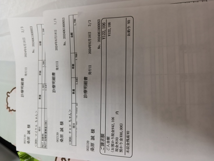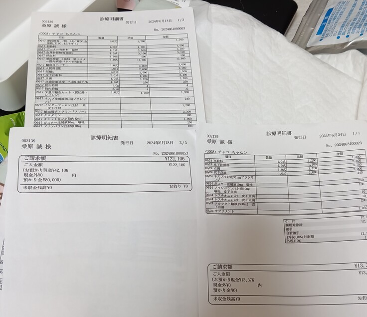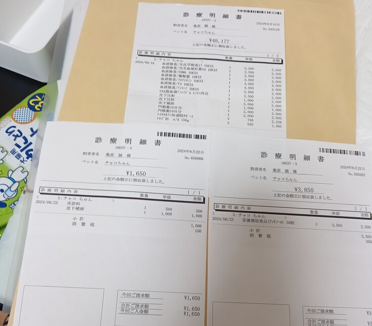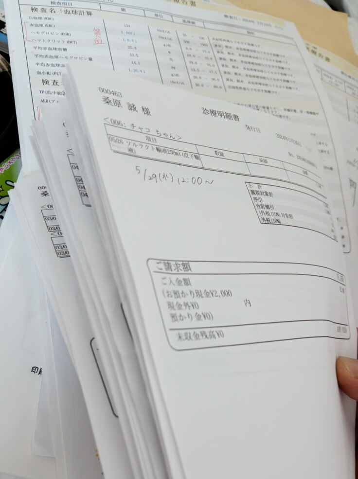 上記明細書はチャコちゃんが2月19日から5月末までの明細書になります。約12万円の医療費になっています。