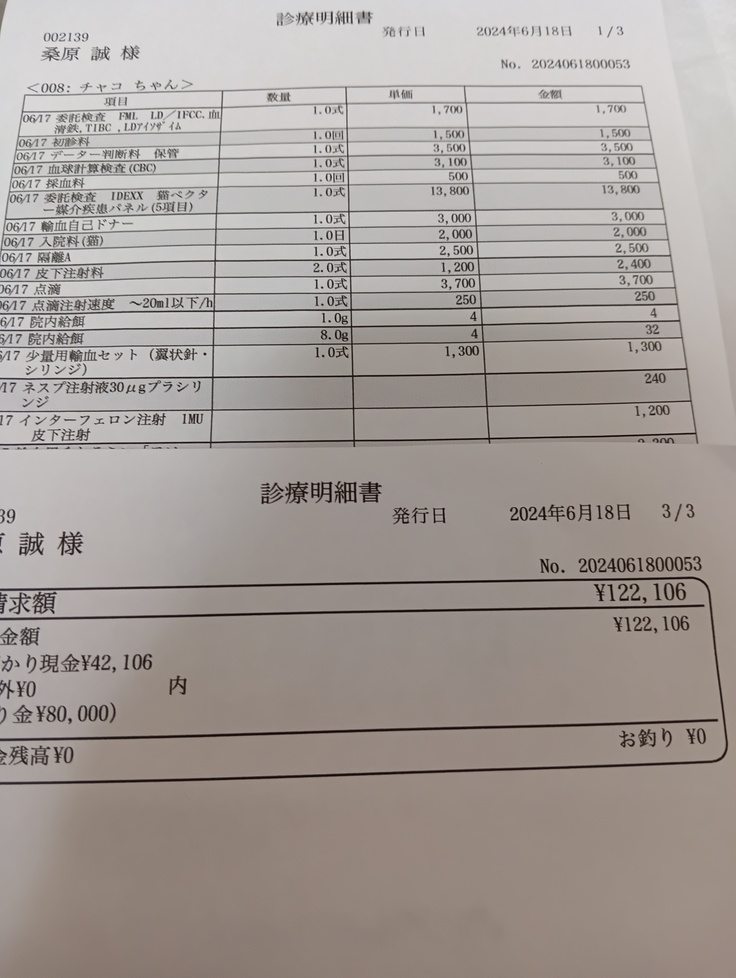 入院が1週間しました。輸血時も供血猫と一泊の入院になりました。