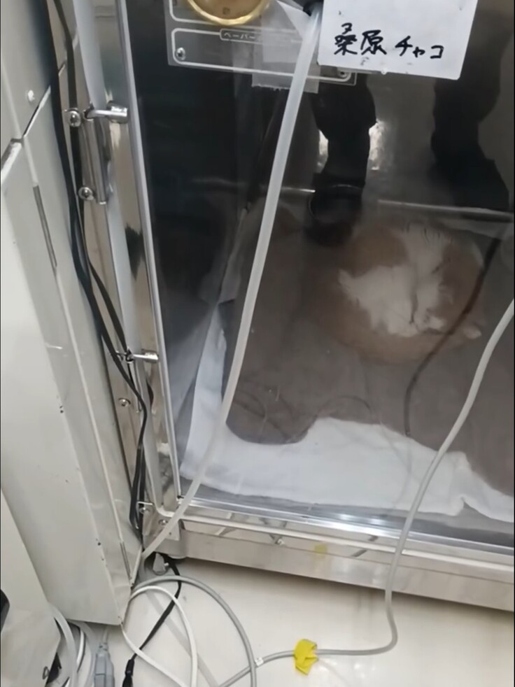 極度の貧血の為に2回目の輸血に昨日供血猫を連れて岡山県の山陽動物医療センターに連れて来て入院してます。