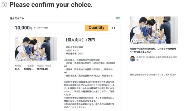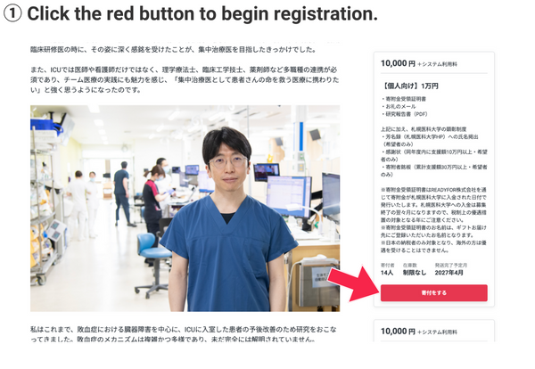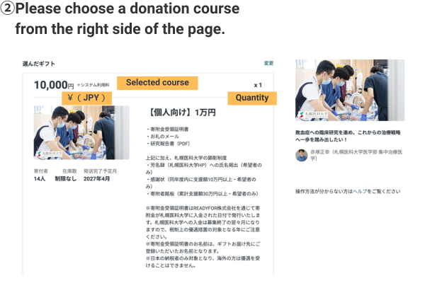 ※寄附金受領証明書はREADYFOR株式会社を通じて寄附金が札幌医科大学に入金された日付で発行いたします。札幌医科大学への入金は募集終了の翌々月になりますので、税制上の優遇措置の対象となる年にご注意ください。