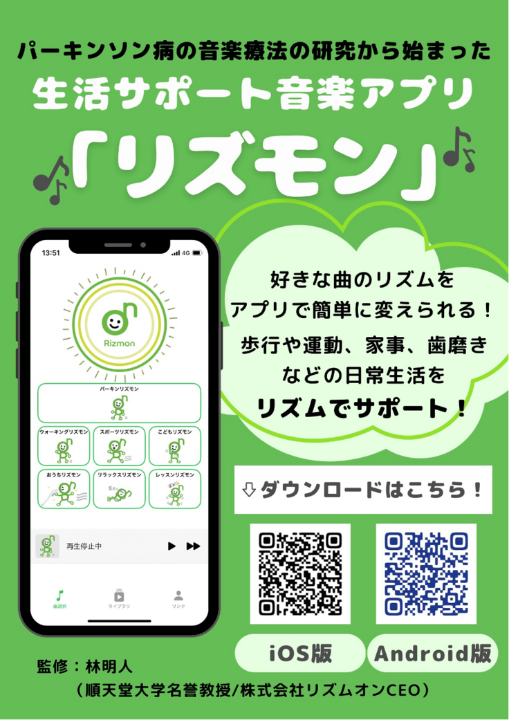 林先生は脳神経内科医でご専門がパーキンソン病です。特にリハビリテーションの一つとして音楽療法の有効性にいち早く着目され、研究と実臨床での応用で多数の成果を上げられています。最近、林先生は患者さんが簡単に利用しやすい音楽療法のアプリを開発されました。それが「リズモン」です。私も試しましたが、大変わかりやすく使いやすいと思いました。私も患者さんに勧めております。