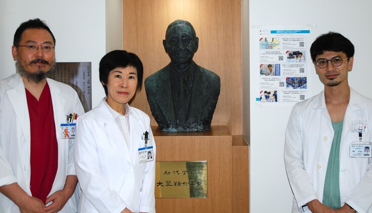※左から私、永石先生、(初代学長の大野先生の胸像)、小山先生
