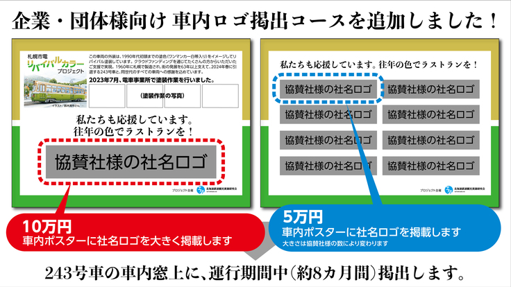 リバイバル塗装後の243号車の車内窓上ポスター(B3サイズ)を2枚使い、ラストランまでの約8カ月間、企業・団体様の名称ロゴを掲出いたします。10万円、5万円の2コースをご用意。塗装作業の様子とともにご紹介するので、注目度、話題性がかなり高いと予想されます。