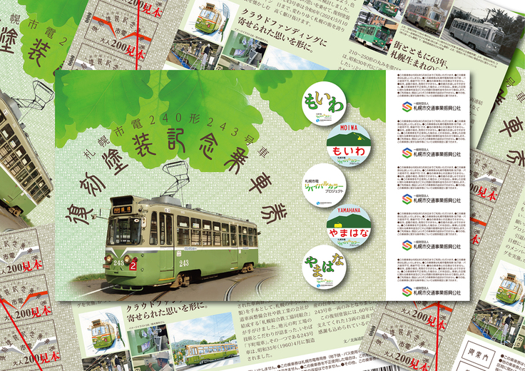 表面には243号車の勇姿とヘッドマークを中心に、かつて山鼻地区のシンボルとして親しまれ、行啓通の停留場名の由来にも深く関わった柏の葉をあしらいました。「復刻塗装記念乗車券」の題字は、往年の回数券や記念乗車券によく使われた篆書体です。また、裏面では243号車を含む「道産電車」や、皆さまにご協力いただいたクラウドファンディングの経緯をご紹介。資料として後世に伝えたいと考えています。