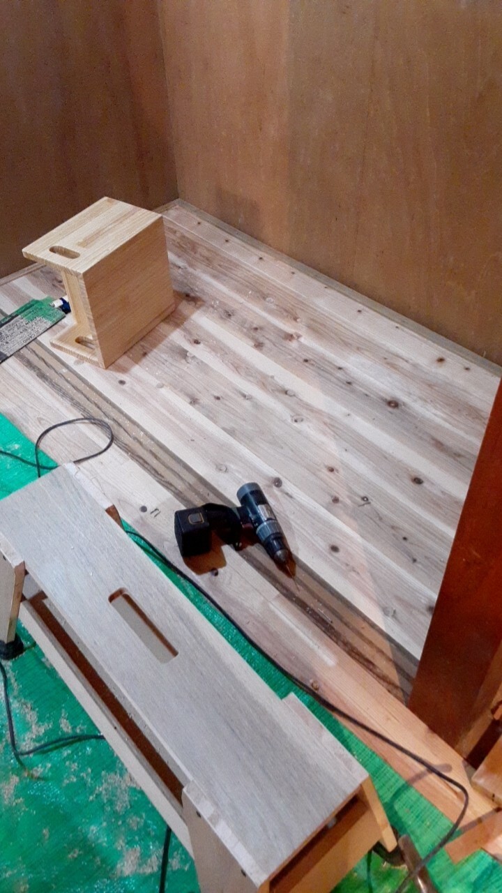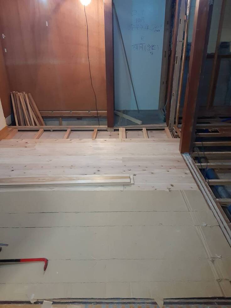 事務室の床はり完成!!(木のぬくもりのある床になりました)