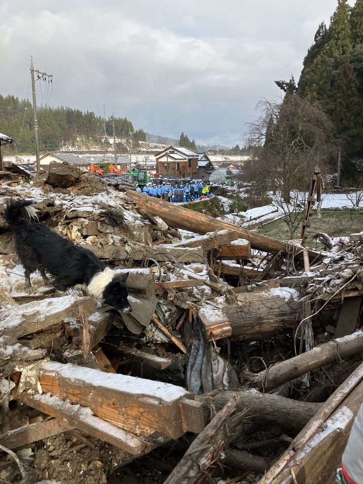 27日 17:02 消防の緊急援助隊の皆様と連携し、捜索開始 犬の反応を伝え、輪島消防署にて待機