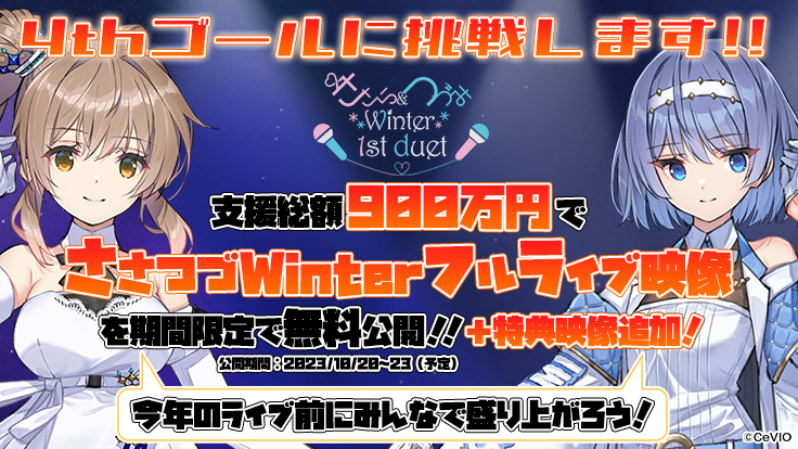 画像の通り、4thゴールで900万円の支援総額を達成した場合、ささらちゃん・つづみちゃんの初のデュエットライブである『ささら&つづみ Winter ~1st duet~』のフルライブ映像を、2023年10月20~23日(予定)に期間限定で無料公開いたします!