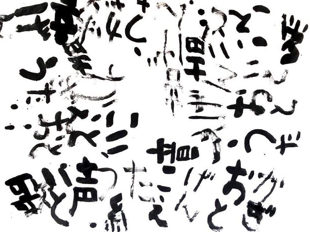 写真は、大きな紙にたくさんの文字を色んな方向から書きいれて