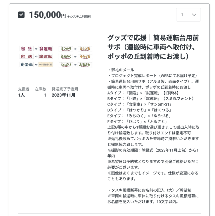 グッズで応援|簡易運転台用前サボ(運搬時に車両へ取付け、ポッポの丘到着時にお渡し)