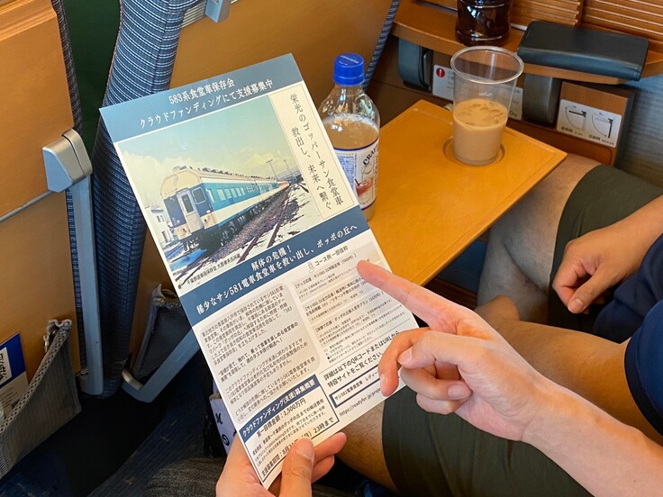 主催者様とご相談の上、受付の際に配布された乗車記念品セットの中に当プロジェクトのチラシを同封させていただきました。貸切列車走行中の車内で車内放送用のマイクをお借りし、参加者の皆さまにチラシを見ていただきながら当プロジェクトの概要を説明させていただきました。