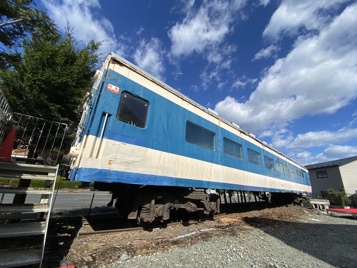 クラウドファンディング開催にあたり車両を保護するために設置したブルーシートを外して久しぶりにサシ581-31電車食堂車がその姿を見せました。