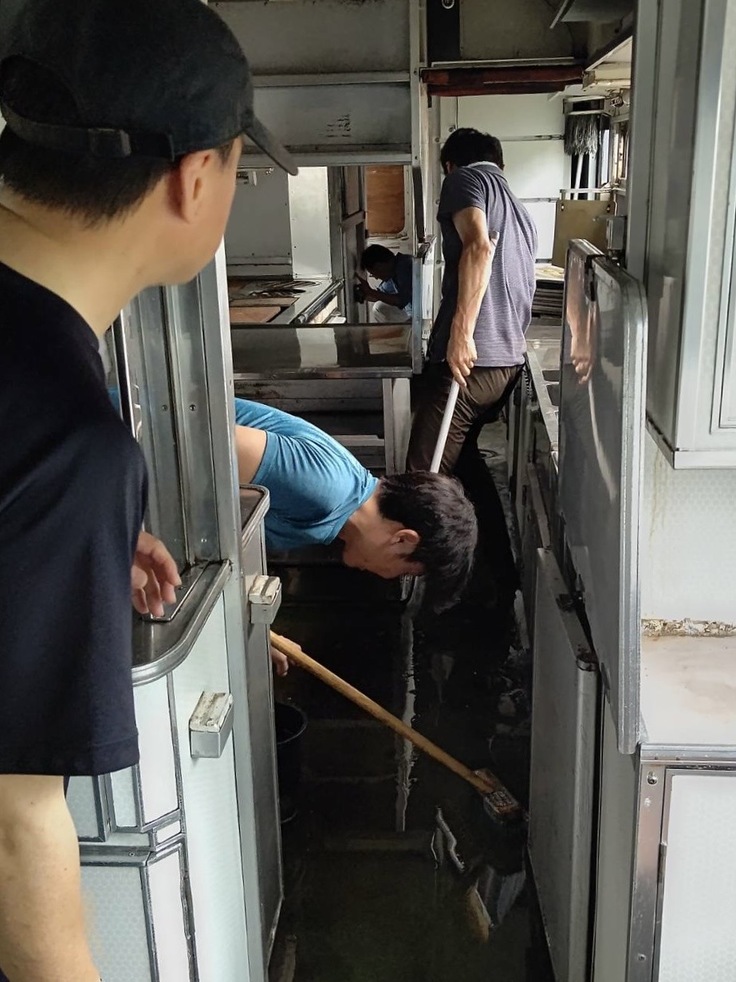 現役当時、一般の人は立ち入ることができなかった厨房部分なども見学いただきながら念入りに清掃していただきました。お暑い中ご参加いただきましてありがとうございました。