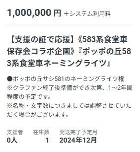 こちらのリターンは、583系食堂車保存会が所有するサシ581-31に、2年間のネーミングライツ権利をリターンとして提供するものです。
