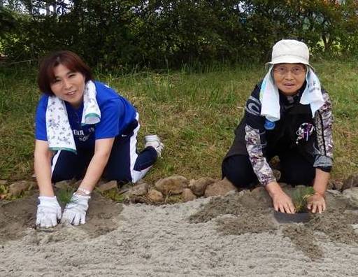 海砂を入れた畑にハマボウフウの種が撒かれマツ苗が移植された。