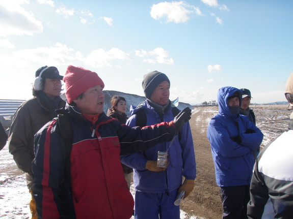 南蒲生でこの冬、海浜植物のレスキューを行うため、現地で実施部隊「緑を守り育てる宮城県連絡会議」に、埋められてしまうエリアと作業方針を説明。