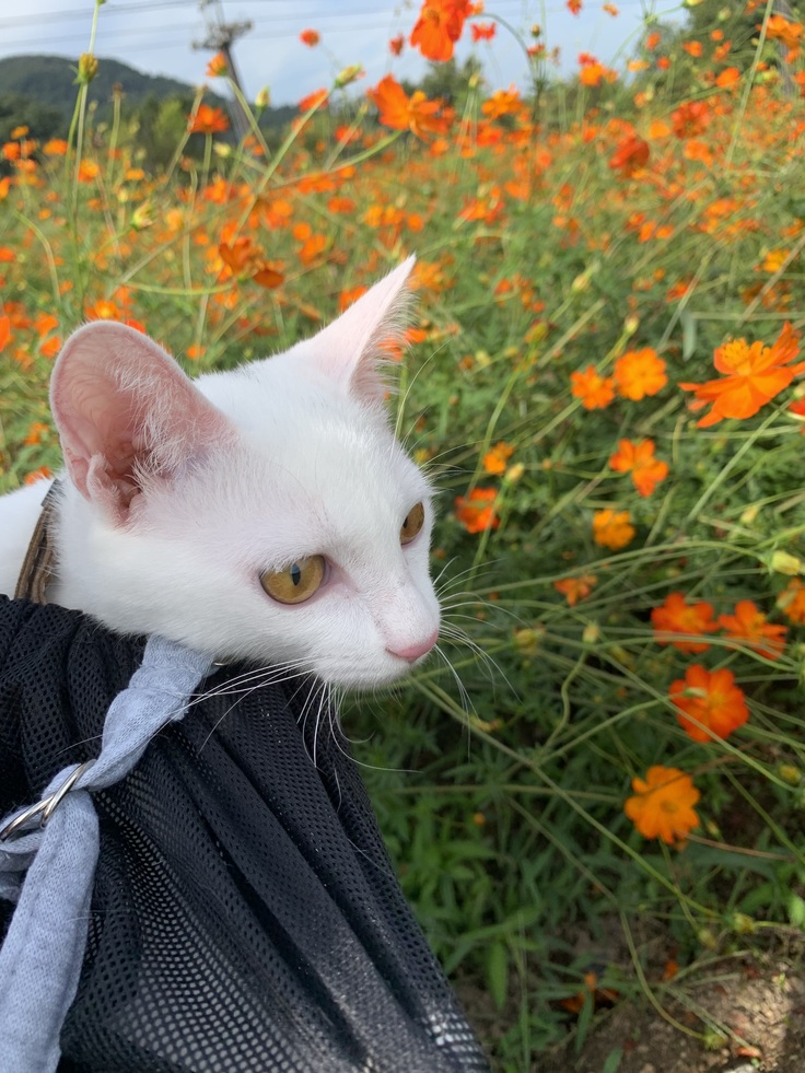 猫用の抱っこ袋?のような物があるそうでして、キャリーに入れたり普通に抱き抱えるよりも、窮屈感がなく安心感があるようで、比較的落ち着いてお散歩ができました。