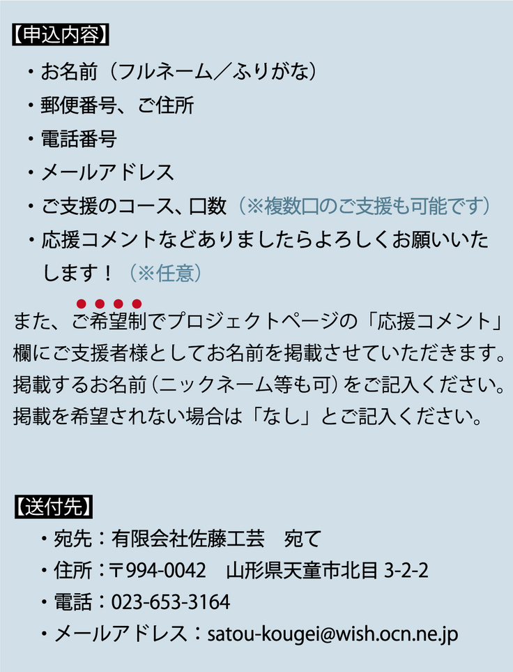①以下の内容を、有限会社佐藤工芸宛にご郵送、メール、お電話、またはFAXにてご提出ください。